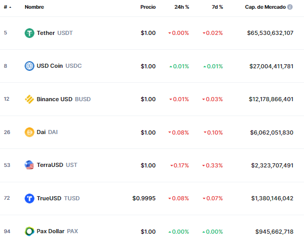 A día de escribir este articulo, la stablecoin USDT que trabaja sobre la red ERC-20 es la más usada con una capitalización de mercado de 65 Billones de $. Le siguen la cola USDC también de la red ERC-20 y BUSD de la red BEP-20.