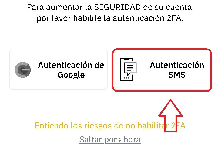 En Binance se puede hacer clic en la opción de Saltar por ahora, sin embargo es altamente recomendable habilitar esta opción, la plataforma presenta dos opciones de autentificación: La primera, Autentificación de Google y la Segunda Autenticación SMS.