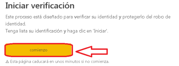 Luego de haber seleccionado el país, se debe hacer clic en la opción de Comenzar, como se muestra en la imagen anterior. Se debe tener en cuenta que los usuarios deben tener a la mano: Foto de su documento de identidad, además se debe tomar una Foto con documento de identidad en la mano. Esto es normal en éste tipo de plataformas, la mayoría lo exige muchas veces para evitar el lavado de dinero.