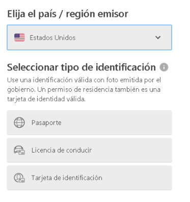 En el siguiente paso se debe elegir una opción de documento que se subirá a la plataforma para la verificación de identidad (Dependiendo del país aparecerán distintas opciones, como pasaporte). Seleccionar el más conveniente.